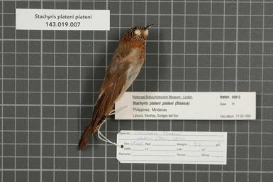 Keywords: Naturalis Biodiversity Center - RMNH.AVES.99812 1 - Stachyris plateni plateni (Blasius, 1890) - Timaliidae - bird skin specimen.jpeg artwork Dimensions artwork Document type Timaliidae Stachyris Individual count 1 Infraspecific epithet plateni Infraspecific rank Institution Naturalis Kind of unit artwork Kind of unit specimen skin Life stage adult Philippines Mindanao Id Surigao del Sur Prov Sibahay Lanuza Medium artwork Nomenclatural code Occurrence ID page Other fields Other versions artwork Permission license Naturalis donation CC-0 Publication location Scientific name Stachyris plateni plateni Blasius 1890 Scientific name authorship Blasius 1890 male Source url http //bioportal naturalis nl Specific epithet plateni State or province Subject keywords artwork Subject keywords publication Title artwork Title publication Type status Uploaded with GWToolset Naturalis_Biodiversity_Center_-_RMNH AVES 99812_1_-_Stachyris_plateni_plateni_ Blasius _1890 _-_Timaliidae_-_bird_skin_specimen http //medialib naturalis nl/file/id/RMNH AVES 99812_1/format/large Media donated by Naturalis Biodiversity Center Songbird specimens at Naturalis Biodiversity Center Dasycrotapha plateni |