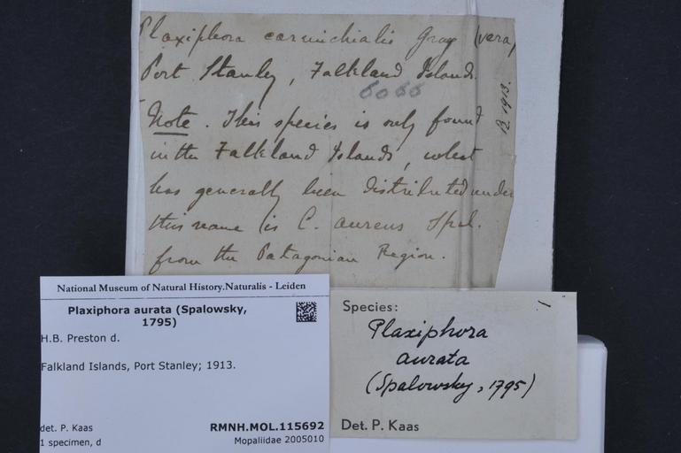 | Keywords: Naturalis Biodiversity Center - RMNH.MOL.115692 1 - Plaxiphora aurata (Spalowsky, 1795) - Mopaliidae - Mollusc shell.jpeg artwork Dimensions artwork Document type Mopaliidae subfamily Mopaliinae Plaxiphora Kaas P Individual count Infraspecific epithet Infraspecific rank Institution Naturalis Kind of unit artwork Kind of unit specimen shell Life stage Falkland Islands Port Stanley; 1913 Medium artwork Nomenclatural code Source institute Leiden Scale the width of the text on the species/QR-code label is 38 mm Occurrence ID page Other fields Other versions artwork Permission license Naturalis donation CC-0 Mollusca Publication location Scientific name Plaxiphora aurata Spalowsky 1795 Scientific name authorship Spalowsky 1795 Source url http //bioportal naturalis nl Specific epithet aurata State or province Subject keywords artwork Subject keywords publication Title artwork Title publication Type status - Uploaded with GWToolset Naturalis_Biodiversity_Center_-_RMNH MOL 115692_1_-_Plaxiphora_aurata_ Spalowsky _1795 _-_Mopaliidae_-_Mollusc_shell http //medialib naturalis nl/file/id/RMNH MOL 115692_1/format/large Molluscs at Naturalis from the Rijksmuseum van Natuurlijke Historie Media donated by Naturalis Biodiversity Center Plaxiphora Plaxiphora aurata |