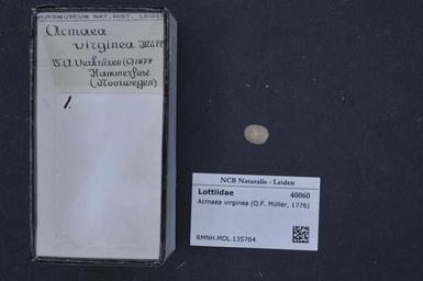 | Keywords: Naturalis Biodiversity Center - RMNH.MOL.135764 - Tectura virginea (Müller, 1776) - Lottiidae - Mollusc shell.jpeg artwork Dimensions artwork Document type Lottiidae Tectura Individual count Infraspecific epithet Infraspecific rank Institution Naturalis Kind of unit artwork Kind of unit specimen shell Life stage Medium artwork Nomenclatural code Source institute Leiden Scale the width of the text on the species/QR-code label is 38 mm Occurrence ID page Other fields Other versions artwork Permission license Naturalis donation CC-0 Mollusca Publication location Scientific name Tectura virginea Müller 1776 Scientific name authorship Müller 1776 Source url http //bioportal naturalis nl Specific epithet virginea State or province Subject keywords artwork Subject keywords publication Title artwork Title publication Type status Uploaded with GWToolset Naturalis_Biodiversity_Center_-_RMNH MOL 135764_-_Tectura_virginea_ Müller _1776 _-_Lottiidae_-_Mollusc_shell http //medialib naturalis nl/file/id/RMNH MOL 135764/format/large Molluscs at Naturalis from the Rijksmuseum van Natuurlijke Historie Media donated by Naturalis Biodiversity Center Tectura virginea |
