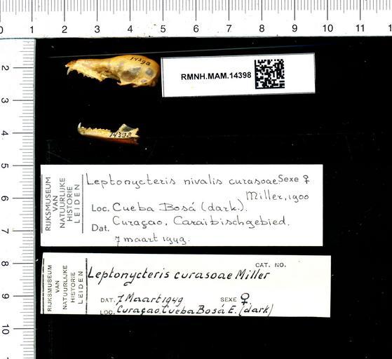 Keywords: Naturalis Biodiversity Center - RMNH.MAM.14398 lat - Leptonycteris curasoae - skull.jpeg artwork Dimensions artwork Document type Leptonycteris Individual count 1 Infraspecific epithet Infraspecific rank Institution Naturalis Kind of unit artwork Kind of unit specimen skull Life stage Cueba Bosá dark Curaçao Caraibischgebied Medium artwork Nomenclatural code Occurrence ID page Other fields Other versions artwork Permission license Naturalis donation CC-0 Publication location Scientific name Leptonycteris curasoae Scientific name authorship female Source url http //bioportal naturalis nl Specific epithet curasoae State or province Subject keywords artwork Subject keywords publication Title artwork Title publication Type status Uploaded with GWToolset Naturalis_Biodiversity_Center_-_RMNH MAM 14398_lat_-_Leptonycteris_curasoae_-_skull http //medialib naturalis nl/file/id/RMNH MAM 14398_lat/format/large Media donated by Naturalis Biodiversity Center Mammals at Naturalis from the Rijksmuseum van Natuurlijke Historie Leptonycteris curasoae Leptonycteris |
