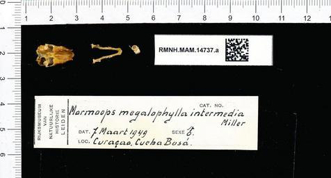 Keywords: Naturalis Biodiversity Center - RMNH.MAM.14737.a pal - Mormoops megalophylla intermedia - skull.jpeg artwork Dimensions artwork Document type Mormoops Individual count 1 Infraspecific epithet intermedia Infraspecific rank Institution Naturalis Kind of unit artwork Kind of unit specimen skull Life stage Curaçao Cueba Bosá Medium artwork Nomenclatural code Occurrence ID page Other fields Other versions artwork Permission license Naturalis donation CC-0 Publication location Scientific name Mormoops megalophylla intermedia Scientific name authorship male Source url http //bioportal naturalis nl Specific epithet megalophylla State or province Subject keywords artwork Subject keywords publication Title artwork Title publication Type status Uploaded with GWToolset Naturalis_Biodiversity_Center_-_RMNH MAM 14737 a_pal_-_Mormoops_megalophylla_intermedia_-_skull http //medialib naturalis nl/file/id/RMNH MAM 14737 a_pal/format/large Media donated by Naturalis Biodiversity Center Mammals at Naturalis from the Rijksmuseum van Natuurlijke Historie Mormoops megalophylla Mormoops |