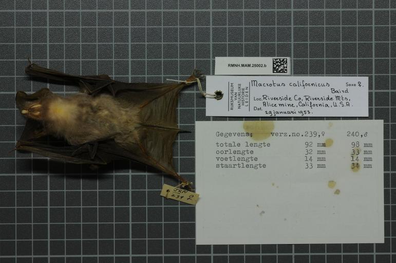 Keywords: Naturalis Biodiversity Center - RMNH.MAM.25002.b ven - Macrotus californicus - skin.jpeg artwork Dimensions artwork Document type Macrotus Individual count 1 Infraspecific epithet Infraspecific rank Institution Naturalis Kind of unit artwork Kind of unit specimen skin Life stage Riverside Co Riverside Mts Alice mine California U S A Medium artwork Nomenclatural code Occurrence ID page Other fields Other versions artwork Permission license Naturalis donation CC-0 Publication location Scientific name Macrotus californicus Scientific name authorship female Source url http //bioportal naturalis nl Specific epithet californicus State or province Subject keywords artwork Subject keywords publication Title artwork Title publication Type status Uploaded with GWToolset Naturalis_Biodiversity_Center_-_RMNH MAM 25002 b_ven_-_Macrotus_californicus_-_skin http //medialib naturalis nl/file/id/RMNH MAM 25002 b_ven/format/large Media donated by Naturalis Biodiversity Center Mammals at Naturalis from the Rijksmuseum van Natuurlijke Historie Macrotus Macrotus californicus |