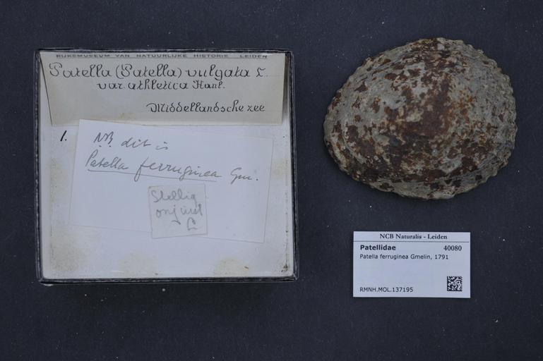 Keywords: Naturalis Biodiversity Center - RMNH.MOL.137195 - Patella ferruginea Gmelin, 1791 - Patellidae - Mollusc shell.jpeg artwork Dimensions artwork Document type Patellidae subfamily Patellinae Patella Individual count Infraspecific epithet Infraspecific rank Institution Naturalis Kind of unit artwork Kind of unit specimen shell Life stage Medium artwork Nomenclatural code Source institute Leiden Scale the width of the text on the species/QR-code label is 38 mm Occurrence ID page Other fields Other versions artwork Permission license Naturalis donation CC-0 Mollusca Publication location Scientific name Patella ferruginea Gmelin 1791 Scientific name authorship Gmelin 1791 Source url http //bioportal naturalis nl Specific epithet ferruginea State or province Subject keywords artwork Subject keywords publication Title artwork Title publication Type status Uploaded with GWToolset Naturalis_Biodiversity_Center_-_RMNH MOL 137195_-_Patella_ferruginea_Gmelin _1791_-_Patellidae_-_Mollusc_shell http //medialib naturalis nl/file/id/RMNH MOL 137195/format/large Molluscs at Naturalis from the Rijksmuseum van Natuurlijke Historie Media donated by Naturalis Biodiversity Center Patella mollusc Patella ferruginea |