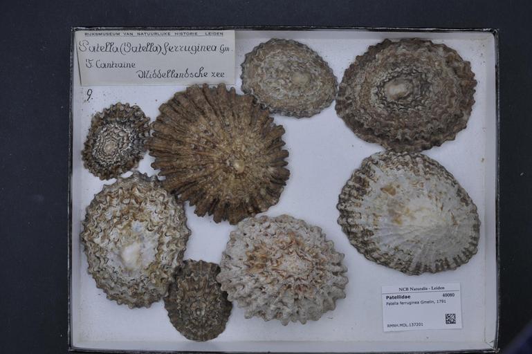 Keywords: Naturalis Biodiversity Center - RMNH.MOL.137201 - Patella ferruginea Gmelin, 1791 - Patellidae - Mollusc shell.jpeg artwork Dimensions artwork Document type Patellidae subfamily Patellinae Patella Individual count Infraspecific epithet Infraspecific rank Institution Naturalis Kind of unit artwork Kind of unit specimen shell Life stage Medium artwork Nomenclatural code Source institute Leiden Scale the width of the text on the species/QR-code label is 38 mm Occurrence ID page Other fields Other versions artwork Permission license Naturalis donation CC-0 Mollusca Publication location Scientific name Patella ferruginea Gmelin 1791 Scientific name authorship Gmelin 1791 Source url http //bioportal naturalis nl Specific epithet ferruginea State or province Subject keywords artwork Subject keywords publication Title artwork Title publication Type status Uploaded with GWToolset Naturalis_Biodiversity_Center_-_RMNH MOL 137201_-_Patella_ferruginea_Gmelin _1791_-_Patellidae_-_Mollusc_shell http //medialib naturalis nl/file/id/RMNH MOL 137201/format/large Molluscs at Naturalis from the Rijksmuseum van Natuurlijke Historie Media donated by Naturalis Biodiversity Center Patella mollusc Patella ferruginea |