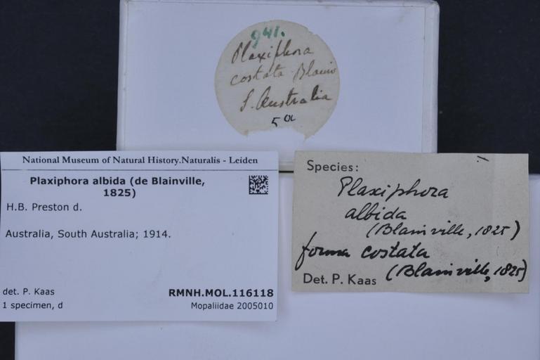 | Keywords: Naturalis Biodiversity Center - RMNH.MOL.116118 1 - Plaxiphora albida (de Blainville, 1825) - Mopaliidae - Mollusc shell.jpeg artwork Dimensions artwork Document type Mopaliidae subfamily Mopaliinae Plaxiphora Kaas P Individual count Infraspecific epithet Infraspecific rank Institution Naturalis Kind of unit artwork Kind of unit specimen shell Life stage Australia South Australia; 1914 Medium artwork Nomenclatural code Source institute Leiden Scale the width of the text on the species/QR-code label is 38 mm Occurrence ID page Other fields Other versions artwork Permission license Naturalis donation CC-0 Mollusca Publication location Scientific name Plaxiphora albida de Blainville 1825 Scientific name authorship De Blainville 1825 Source url http //bioportal naturalis nl Specific epithet albida State or province South Australia Subject keywords artwork Subject keywords publication Title artwork Title publication Type status - Uploaded with GWToolset Naturalis_Biodiversity_Center_-_RMNH MOL 116118_1_-_Plaxiphora_albida_ de_Blainville _1825 _-_Mopaliidae_-_Mollusc_shell http //medialib naturalis nl/file/id/RMNH MOL 116118_1/format/large Molluscs at Naturalis from the Rijksmuseum van Natuurlijke Historie Media donated by Naturalis Biodiversity Center Plaxiphora Plaxiphora albida |