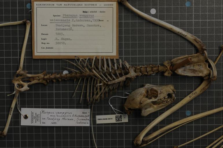 Keywords: Naturalis Biodiversity Center - RMNH.MAM.38018 gen - Pteropus vampyrus malaccensis - skeleton (whole).jpeg artwork Dimensions artwork Document type Pteropus Individual count 1 Infraspecific epithet malaccensis Infraspecific rank Institution Naturalis Kind of unit artwork Kind of unit specimen skeleton whole Life stage Tandjong Morawa Sumatra Indonesia Medium artwork Nomenclatural code Occurrence ID page Other fields Other versions artwork Permission license Naturalis donation CC-0 Publication location Scientific name Pteropus vampyrus malaccensis Scientific name authorship Source url http //bioportal naturalis nl Specific epithet vampyrus State or province Subject keywords artwork Subject keywords publication Title artwork Title publication Type status Uploaded with GWToolset Naturalis_Biodiversity_Center_-_RMNH MAM 38018_gen_-_Pteropus_vampyrus_malaccensis_-_skeleton_ whole http //medialib naturalis nl/file/id/RMNH MAM 38018_gen/format/large Media donated by Naturalis Biodiversity Center Mammals at Naturalis from the Rijksmuseum van Natuurlijke Historie Pteropus vampyrus Pteropus |