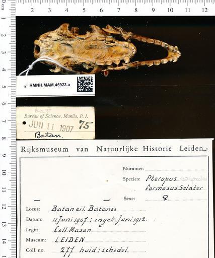 Keywords: Naturalis Biodiversity Center - RMNH.MAM.45923.a pal - Pteropus dasymallus formosus - skull.jpeg artwork Dimensions artwork Document type Pteropus Individual count 1 Infraspecific epithet formosus Infraspecific rank Institution Naturalis Kind of unit artwork Kind of unit specimen skull Life stage breeding Batan eil Batanes Medium artwork Nomenclatural code Occurrence ID page Other fields Other versions artwork Permission license Naturalis donation CC-0 Publication location Scientific name Pteropus dasymallus formosus Scientific name authorship female Source url http //bioportal naturalis nl Specific epithet dasymallus State or province Subject keywords artwork Subject keywords publication Title artwork Title publication Type status Uploaded with GWToolset Naturalis_Biodiversity_Center_-_RMNH MAM 45923 a_pal_-_Pteropus_dasymallus_formosus_-_skull http //medialib naturalis nl/file/id/RMNH MAM 45923 a_pal/format/large Mammals at Naturalis from the Rijksmuseum van Natuurlijke Historie Media donated by Naturalis Biodiversity Center Pteropus dasymallus Pteropus |