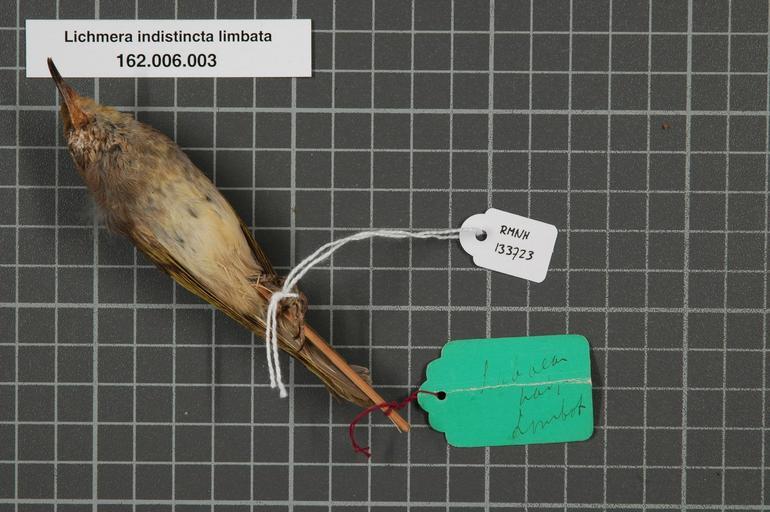 | Keywords: Naturalis Biodiversity Center - RMNH.AVES.133723 2 - Lichmera indistincta limbata (S. Muller, 1843) - Meliphagidae - bird skin specimen.jpeg artwork Dimensions artwork Document type Meliphagidae Lichmera Individual count 1 Infraspecific epithet limbata Infraspecific rank Institution Naturalis Kind of unit artwork Kind of unit specimen skin Life stage Lombok Laboean hadji Medium artwork Nomenclatural code General remarks Probably collected and donated by Vorderman Occurrence ID page Other fields Other versions artwork Permission license Naturalis donation CC-0 Publication location Scientific name Lichmera indistincta limbata S Muller 1843 Scientific name authorship S Müller 1843 Source url http //bioportal naturalis nl Specific epithet indistincta State or province Lombok Subject keywords artwork Subject keywords publication Title artwork Title publication Type status Uploaded with GWToolset Naturalis_Biodiversity_Center_-_RMNH AVES 133723_2_-_Lichmera_indistincta_limbata_ S _Muller _1843 _-_Meliphagidae_-_bird_skin_specimen http //medialib naturalis nl/file/id/RMNH AVES 133723_2/format/large Media donated by Naturalis Biodiversity Center Songbird specimens at Naturalis Biodiversity Center Lichmera indistincta Lichmera |