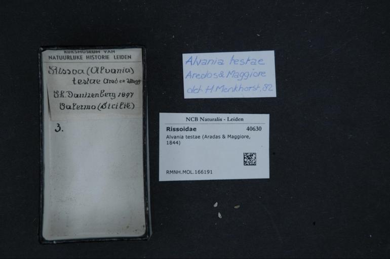 Keywords: Naturalis Biodiversity Center - RMNH.MOL.166191 - Alvania testae (Aradas & Maggiore, 1844) - Rissoidae - Mollusc shell.jpeg artwork Dimensions artwork Document type Rissoidae subfamily Rissoinae Alvania Individual count Infraspecific epithet Infraspecific rank Institution Naturalis Kind of unit artwork Kind of unit specimen shell Life stage Medium artwork Nomenclatural code Scale the width of the text on the species/QR-code label is 38 mm Occurrence ID page Other fields Other versions artwork Permission license Naturalis donation CC-0 Mollusca Publication location Scientific name Alvania testae Aradas Maggiore 1844 Scientific name authorship Aradas Maggiore 1844 Source url http //bioportal naturalis nl Specific epithet testae State or province Subject keywords artwork Subject keywords publication Title artwork Title publication Type status Uploaded with GWToolset Naturalis_Biodiversity_Center_-_RMNH MOL 166191_-_Alvania_testae_ Aradas_ _Maggiore _1844 _-_Rissoidae_-_Mollusc_shell http //medialib naturalis nl/file/id/RMNH MOL 166191/format/large Media donated by Naturalis Biodiversity Center Molluscs at Naturalis from the Rijksmuseum van Natuurlijke Historie Alvania testae Alvania |