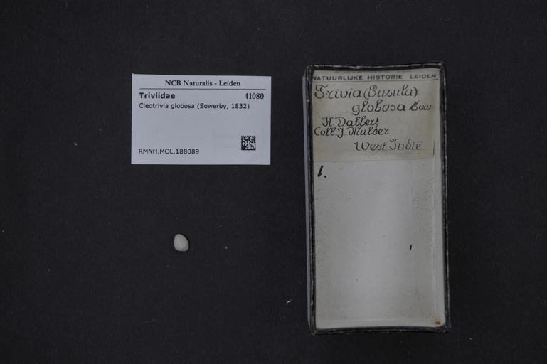 | Keywords: Naturalis Biodiversity Center - RMNH.MOL.188089 - Cleotrivia globosa (Sowerby, 1832) - Triviidae - Mollusc shell.jpeg artwork Dimensions artwork Document type Triviidae Cleotrivia Individual count Infraspecific epithet Infraspecific rank Institution Naturalis Kind of unit artwork Kind of unit specimen shell Life stage Medium artwork Nomenclatural code Source institute Rijksmuseum van Natuurlijke Historie Leiden Scale the width of the text on the species/QR-code label is 38 mm Occurrence ID page Other fields Other versions artwork Permission license Naturalis donation CC-0 Mollusca Publication location Scientific name Cleotrivia globosa Sowerby 1832 Scientific name authorship Sowerby 1832 Source url http //bioportal naturalis nl Specific epithet globosa State or province Subject keywords artwork Subject keywords publication Title artwork Title publication Type status Uploaded with GWToolset Naturalis_Biodiversity_Center_-_RMNH MOL 188089_-_Cleotrivia_globosa_ Sowerby _1832 _-_Triviidae_-_Mollusc_shell http //medialib naturalis nl/file/id/RMNH MOL 188089/format/large Media donated by Naturalis Biodiversity Center Molluscs at Naturalis from the Rijksmuseum van Natuurlijke Historie Cleotrivia globosa Cleotrivia |