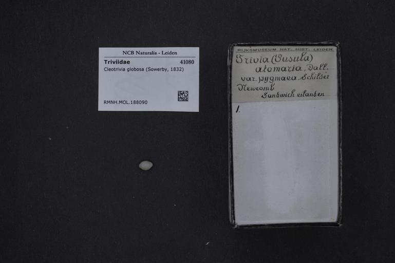 | Keywords: Naturalis Biodiversity Center - RMNH.MOL.188090 - Cleotrivia globosa (Sowerby, 1832) - Triviidae - Mollusc shell.jpeg artwork Dimensions artwork Document type Triviidae Cleotrivia Individual count Infraspecific epithet Infraspecific rank Institution Naturalis Kind of unit artwork Kind of unit specimen shell Life stage Medium artwork Nomenclatural code Source institute Rijksmuseum van Natuurlijke Historie Leiden Scale the width of the text on the species/QR-code label is 38 mm Occurrence ID page Other fields Other versions artwork Permission license Naturalis donation CC-0 Mollusca Publication location Scientific name Cleotrivia globosa Sowerby 1832 Scientific name authorship Sowerby 1832 Source url http //bioportal naturalis nl Specific epithet globosa State or province Subject keywords artwork Subject keywords publication Title artwork Title publication Type status Uploaded with GWToolset Naturalis_Biodiversity_Center_-_RMNH MOL 188090_-_Cleotrivia_globosa_ Sowerby _1832 _-_Triviidae_-_Mollusc_shell http //medialib naturalis nl/file/id/RMNH MOL 188090/format/large Media donated by Naturalis Biodiversity Center Molluscs at Naturalis from the Rijksmuseum van Natuurlijke Historie Cleotrivia globosa Cleotrivia |