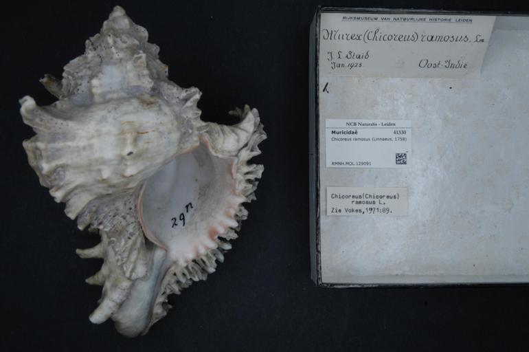 | Keywords: Naturalis Biodiversity Center - RMNH.MOL.129091 - Chicoreus ramosus (Linnaeus, 1758) - Muricidae - Mollusc shell.jpeg artwork Dimensions artwork Document type Muricidae subfamily Muricinae Chicoreus Individual count Infraspecific epithet Infraspecific rank Institution Naturalis Kind of unit artwork Kind of unit specimen shell Life stage Medium artwork Nomenclatural code Source institute Leiden Scale the width of the text on the species/QR-code label is 38 mm Occurrence ID page Neogastropoda Other fields Other versions artwork Permission license Naturalis donation CC-0 Mollusca Publication location Scientific name Chicoreus ramosus Linnaeus 1758 Scientific name authorship Linnaeus 1758 Source url http //bioportal naturalis nl Specific epithet ramosus State or province Subject keywords artwork Subject keywords publication Title artwork Title publication Type status Uploaded with GWToolset Naturalis_Biodiversity_Center_-_RMNH MOL 129091_-_Chicoreus_ramosus_ Linnaeus _1758 _-_Muricidae_-_Mollusc_shell http //medialib naturalis nl/file/id/RMNH MOL 129091/format/large Molluscs at Naturalis from the Rijksmuseum van Natuurlijke Historie Media donated by Naturalis Biodiversity Center Chicoreus ramosus |