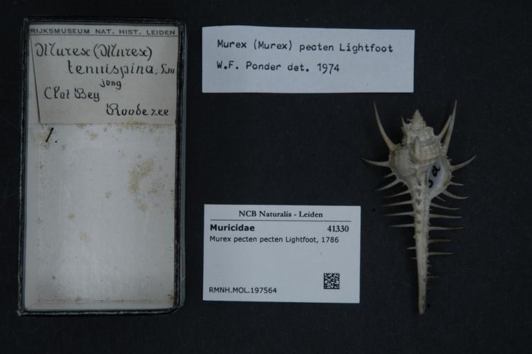 | Keywords: Naturalis Biodiversity Center - RMNH.MOL.197564 - Murex pecten pecten Lightfoot, 1786 - Muricidae - Mollusc shell.jpeg artwork Dimensions artwork Document type Muricidae subfamily Muricinae Murex Individual count Infraspecific epithet pecten Infraspecific rank Institution Naturalis Kind of unit artwork Kind of unit specimen shell Life stage Medium artwork Nomenclatural code Source institute Rijksmuseum van Natuurlijke Historie Leiden Scale the width of the text on the species/QR-code label is 38 mm Occurrence ID page Neogastropoda Other fields Other versions artwork Permission license Naturalis donation CC-0 Mollusca Publication location Scientific name Murex pecten pecten Lightfoot 1786 Scientific name authorship Lightfoot 1786 Source url http //bioportal naturalis nl Specific epithet pecten State or province Subject keywords artwork Subject keywords publication Title artwork Title publication Type status Uploaded with GWToolset Naturalis_Biodiversity_Center_-_RMNH MOL 197564_-_Murex_pecten_pecten_Lightfoot _1786_-_Muricidae_-_Mollusc_shell http //medialib naturalis nl/file/id/RMNH MOL 197564/format/large Media donated by Naturalis Biodiversity Center Molluscs at Naturalis from the Rijksmuseum van Natuurlijke Historie Murex pecten |