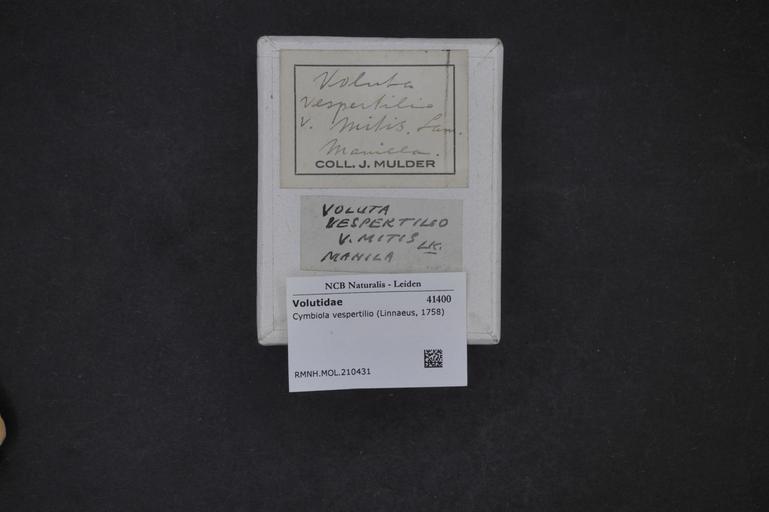 Keywords: Naturalis Biodiversity Center - RMNH.MOL.210431 1 - Cymbiola vespertilio Linnaeus, 1758 - Volutidae - Mollusc shell.jpeg artwork Dimensions artwork Document type Volutidae Cymbiola Individual count Infraspecific epithet Infraspecific rank Institution Naturalis Kind of unit artwork Kind of unit specimen shell Life stage Medium artwork Nomenclatural code Source institute Rijksmuseum van Natuurlijke Historie Leiden Scale the width of the text on the species/QR-code label is 38 mm Occurrence ID page Neogastropoda Other fields Other versions artwork Permission license Naturalis donation CC-0 Mollusca Publication location Scientific name Cymbiola vespertilio Linnaeus 1758 Scientific name authorship Linnaeus 1758 Source url http //bioportal naturalis nl Specific epithet vespertilio State or province Subject keywords artwork Subject keywords publication Title artwork Title publication Type status Uploaded with GWToolset Naturalis_Biodiversity_Center_-_RMNH MOL 210431_1_-_Cymbiola_vespertilio_Linnaeus _1758_-_Volutidae_-_Mollusc_shell http //medialib naturalis nl/file/id/RMNH MOL 210431_1/format/large Media donated by Naturalis Biodiversity Center Molluscs at Naturalis from the Rijksmuseum van Natuurlijke Historie Cymbiola vespertilio Cymbiola |