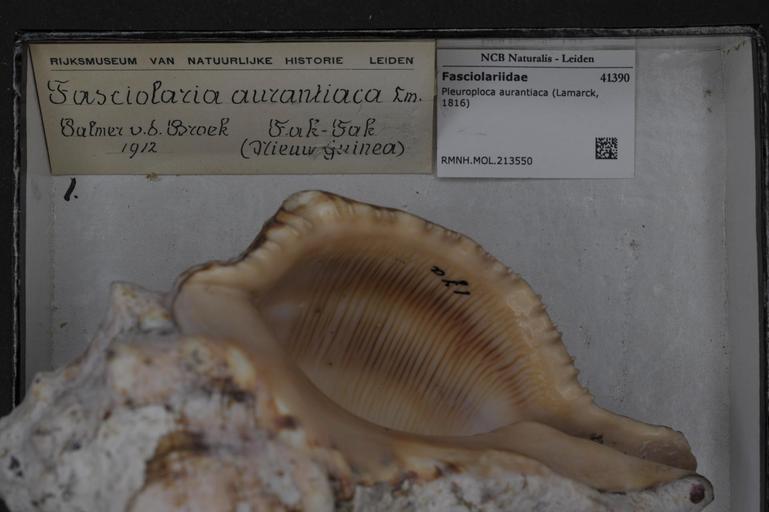 | Keywords: Naturalis Biodiversity Center - RMNH.MOL.213550 - Pleuroploca aurantiaca (Lamarck, 1816) - Fasciolariidae - Mollusc shell.jpeg artwork Dimensions artwork Document type Fasciolariidae subfamily Fasciolariinae Pleuroploca Individual count Infraspecific epithet Infraspecific rank Institution Naturalis Kind of unit artwork Kind of unit specimen shell Life stage Medium artwork Nomenclatural code Source institute Rijksmuseum van Natuurlijke Historie Leiden Scale the width of the text on the species/QR-code label is 38 mm Occurrence ID page Other fields Other versions artwork Permission license Naturalis donation CC-0 Mollusca Publication location Scientific name Pleuroploca aurantiaca Lamarck 1816 Scientific name authorship Lamarck 1816 Source url http //bioportal naturalis nl Specific epithet aurantiaca State or province Subject keywords artwork Subject keywords publication Title artwork Title publication Type status Uploaded with GWToolset Naturalis_Biodiversity_Center_-_RMNH MOL 213550_-_Pleuroploca_aurantiaca_ Lamarck _1816 _-_Fasciolariidae_-_Mollusc_shell http //medialib naturalis nl/file/id/RMNH MOL 213550/format/large Media donated by Naturalis Biodiversity Center Molluscs at Naturalis from the Rijksmuseum van Natuurlijke Historie Pleuroploca aurantiaca Pleuroploca |