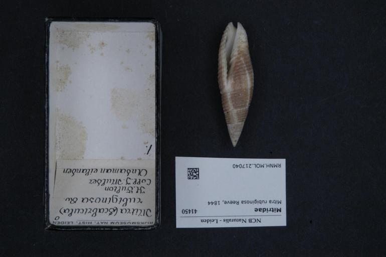 | Keywords: Naturalis Biodiversity Center - RMNH.MOL.217040 - Mitra rubiginosa Reeve, 1844 - Mitridae - Mollusc shell.jpeg artwork Dimensions artwork Document type Mitridae subfamily Mitrinae Mitra Individual count Infraspecific epithet Infraspecific rank Institution Naturalis Kind of unit artwork Kind of unit specimen shell Life stage Medium artwork Nomenclatural code Source institute Rijksmuseum van Natuurlijke Historie Leiden Scale the width of the text on the species/QR-code label is 38 mm Occurrence ID page Neogastropoda Other fields Other versions artwork Permission license Naturalis donation CC-0 Mollusca Publication location Scientific name Mitra rubiginosa Reeve 1844 Scientific name authorship Reeve 1844 Source url http //bioportal naturalis nl Specific epithet rubiginosa State or province Subject keywords artwork Subject keywords publication Title artwork Title publication Type status Uploaded with GWToolset Naturalis_Biodiversity_Center_-_RMNH MOL 217040_-_Mitra_rubiginosa_Reeve _1844_-_Mitridae_-_Mollusc_shell http //medialib naturalis nl/file/id/RMNH MOL 217040/format/large Molluscs at Naturalis from the Rijksmuseum van Natuurlijke Historie Media donated by Naturalis Biodiversity Center Mitra rubiginosa Mitra |