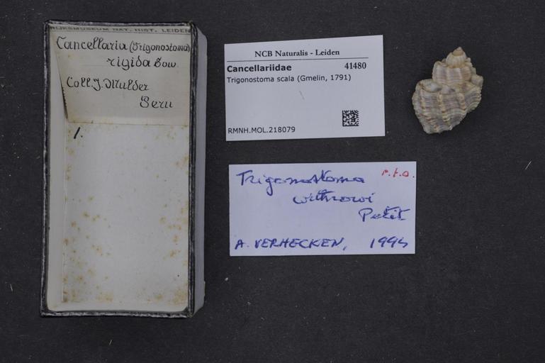| Keywords: Naturalis Biodiversity Center - RMNH.MOL.218079 - Trigonostoma scala (Gmelin, 1791) - Cancellariidae - Mollusc shell.jpeg artwork Dimensions artwork Document type Cancellariidae subfamily Cancellariinae Trigonostoma Individual count Infraspecific epithet Infraspecific rank Institution Naturalis Kind of unit artwork Kind of unit specimen shell Life stage Medium artwork Nomenclatural code Source institute Rijksmuseum van Natuurlijke Historie Leiden Scale the width of the text on the species/QR-code label is 38 mm Occurrence ID page Other fields Other versions artwork Permission license Naturalis donation CC-0 Mollusca Publication location Scientific name Trigonostoma scala Gmelin 1791 Scientific name authorship Gmelin 1791 Source url http //bioportal naturalis nl Specific epithet scala State or province Subject keywords artwork Subject keywords publication Title artwork Title publication Type status Uploaded with GWToolset Naturalis_Biodiversity_Center_-_RMNH MOL 218079_-_Trigonostoma_scala_ Gmelin _1791 _-_Cancellariidae_-_Mollusc_shell http //medialib naturalis nl/file/id/RMNH MOL 218079/format/large Molluscs at Naturalis from the Rijksmuseum van Natuurlijke Historie Media donated by Naturalis Biodiversity Center Trigonostoma scala Trigonostoma |