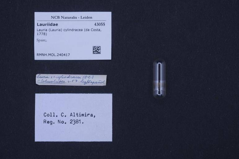 | Keywords: Naturalis Biodiversity Center - RMNH.MOL.240417 - Lauria (Lauria) cylindracea (Da Costa, 1778) - Lauriidae - Mollusc shell.jpeg artwork Dimensions artwork Document type Lauriidae Lauria Individual count Infraspecific epithet Infraspecific rank Institution Naturalis Kind of unit artwork Kind of unit specimen shell Life stage Spain Medium artwork Nomenclatural code Source institute Rijksmuseum van Natuurlijke Historie Leiden Scale the width of the text on the species/QR-code label is 38 mm Occurrence ID page Other fields Other versions artwork Permission license Naturalis donation CC-0 Mollusca Publication location Scientific name Lauria Lauria cylindracea Da Costa 1778 Scientific name authorship Da Costa 1778 Source url http //bioportal naturalis nl Specific epithet cylindracea State or province Subject keywords artwork Subject keywords publication Title artwork Title publication Type status Uploaded with GWToolset Naturalis_Biodiversity_Center_-_RMNH MOL 240417_-_Lauria_ Lauria _cylindracea_ Da_Costa _1778 _-_Lauriidae_-_Mollusc_shell http //medialib naturalis nl/file/id/RMNH MOL 240417/format/large Molluscs at Naturalis from the Rijksmuseum van Natuurlijke Historie Media donated by Naturalis Biodiversity Center Lauria cylindracea Lauria |