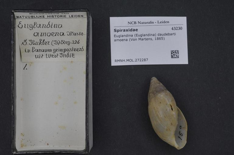 | Keywords: Naturalis Biodiversity Center - RMNH.MOL.272287 - Euglandina (Euglandina) daudebarti amoena (Von Martens, 1865) - Spiraxidae - Mollusc shell.jpeg artwork Dimensions artwork Document type Spiraxidae subfamily Euglandininae Euglandina Individual count Infraspecific epithet amoena Infraspecific rank Institution Naturalis Kind of unit artwork Kind of unit specimen shell Life stage Medium artwork Nomenclatural code Source institute Rijksmuseum van Natuurlijke Historie Leiden Scale the width of the text on the species/QR-code label is 38 mm Occurrence ID page Other fields Other versions artwork Permission license Naturalis donation CC-0 Mollusca Publication location Scientific name Euglandina Euglandina daudebarti amoena Von Martens 1865 Scientific name authorship Von Martens 1865 Source url http //bioportal naturalis nl Specific epithet daudebarti State or province Subject keywords artwork Subject keywords publication Title artwork Title publication Type status Uploaded with GWToolset Naturalis_Biodiversity_Center_-_RMNH MOL 272287_-_Euglandina_ Euglandina _daudebarti_amoena_ Von_Martens _1865 _-_Spiraxidae_-_Mollusc_shell http //medialib naturalis nl/file/id/RMNH MOL 272287/format/large Molluscs at Naturalis from the Rijksmuseum van Natuurlijke Historie Media donated by Naturalis Biodiversity Center Euglandina daudebarti Euglandina |