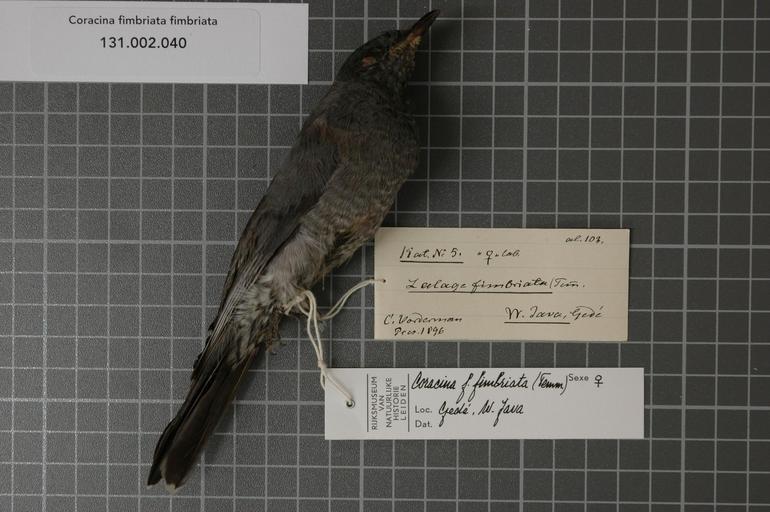 | Keywords: Naturalis Biodiversity Center - RMNH.AVES.123833 1 - Coracina fimbriata fimbriata (Temminck, 1824) - Campephagidae - bird skin specimen.jpeg artwork Dimensions artwork Document type Campephagidae Coracina Individual count 1 Infraspecific epithet fimbriata Infraspecific rank Institution Naturalis Kind of unit artwork Kind of unit specimen skin Life stage Indonesia W Java Gedé Medium artwork Nomenclatural code Sex remark female lab Occurrence ID page Other fields Other versions artwork Permission license Naturalis donation CC-0 Publication location Scientific name Coracina fimbriata fimbriata Temminck 1824 Scientific name authorship Temminck 1824 female Source url http //bioportal naturalis nl Specific epithet fimbriata State or province W Java Subject keywords artwork Subject keywords publication Title artwork Title publication Type status Uploaded with GWToolset Naturalis_Biodiversity_Center_-_RMNH AVES 123833_1_-_Coracina_fimbriata_fimbriata_ Temminck _1824 _-_Campephagidae_-_bird_skin_specimen http //medialib naturalis nl/file/id/RMNH AVES 123833_1/format/large Media donated by Naturalis Biodiversity Center Songbird specimens at Naturalis Biodiversity Center Coracina fimbriata fimbriata |