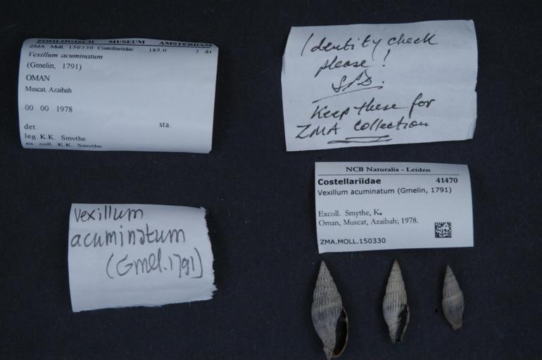| Keywords: Naturalis Biodiversity Center - ZMA.MOLL.150330 1 - Vexillum acuminatum (Gmelin, 1791) - Costellariidae - Mollusc shell.jpeg artwork Dimensions artwork Document type Costellariidae Vexillum Individual count Infraspecific epithet Infraspecific rank Institution Naturalis Kind of unit artwork Kind of unit specimen shell Life stage Oman Muscat Azaibah; 1978 Medium artwork Nomenclatural code Collection remarks Moll Scale the width of the text on the species/QR-code label is 38 mm Occurrence ID page Neogastropoda Other fields Other versions artwork Permission license Naturalis donation CC-0 Mollusca Publication location Scientific name Vexillum acuminatum Gmelin 1791 Scientific name authorship Gmelin 1791 Source url http //bioportal naturalis nl Specific epithet acuminatum State or province Subject keywords artwork Subject keywords publication Title artwork Title publication Type status Uploaded with GWToolset Naturalis_Biodiversity_Center_-_ZMA MOLL 150330_1_-_Vexillum_acuminatum_ Gmelin _1791 _-_Costellariidae_-_Mollusc_shell http //medialib naturalis nl/file/id/ZMA MOLL 150330_1/format/large Media donated by Naturalis Biodiversity Center Molluscs at Naturalis from the Zoölogisch Museum Amsterdam Vexillum acuminatum Vexillum |