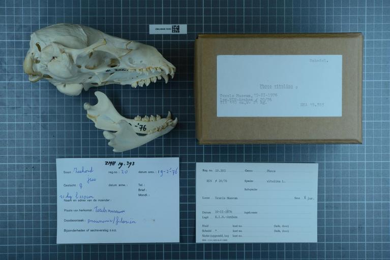 | Keywords: Naturalis Biodiversity Center - ZMA.MAM.19393 lat - Phoca vitulina Linnaeus, 1758 - skull.jpeg artwork Dimensions artwork Document type Phoca Individual count 1 Infraspecific epithet Infraspecific rank Institution Naturalis Kind of unit artwork Kind of unit specimen skull Life stage Juvenile Netherlands NH Texel Medium artwork Nomenclatural code Occurrence ID page Other fields Other versions artwork Permission license Naturalis donation CC-0 Publication location Scientific name Phoca vitulina Linnaeus 1758 Scientific name authorship Linnaeus 1758 female Source url http //bioportal naturalis nl Specific epithet vitulina State or province NH Subject keywords artwork Subject keywords publication Title artwork Title publication Type status Uploaded with GWToolset Naturalis_Biodiversity_Center_-_ZMA MAM 19393_lat_-_Phoca_vitulina_Linnaeus _1758_-_skull http //medialib naturalis nl/file/id/ZMA MAM 19393_lat/format/large Mammals at Naturalis from the Zoölogisch Museum Amsterdam Media donated by Naturalis Biodiversity Center Phoca vitulina Phoca |