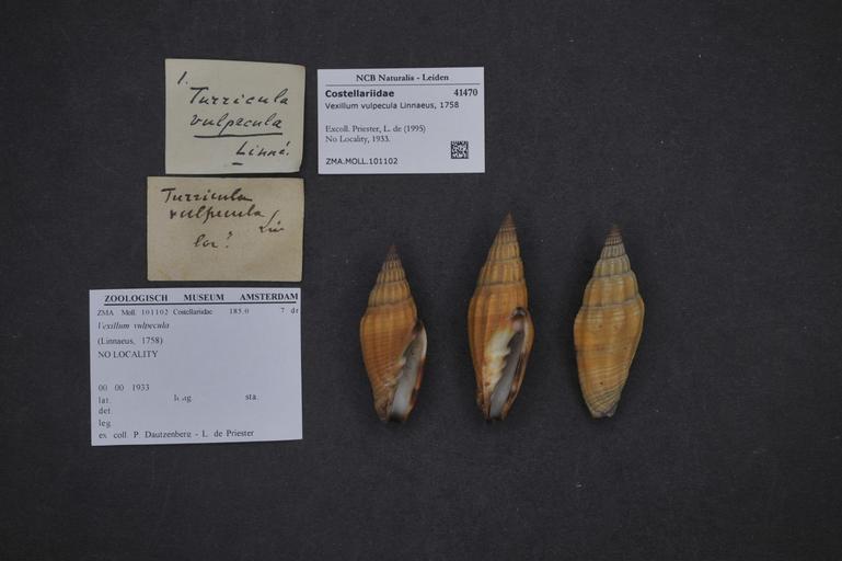 Keywords: Naturalis Biodiversity Center - ZMA.MOLL.101102 - Vexillum vulpecula (Linnaeus, 1758) - Costellariidae - Mollusc shell.jpeg Author artwork Author publication Basis of record Preserved specimen Catalog number ZMA MOLL 101102 Gastropoda Collection code Mollusca Collection date 0-0-1933 artwork Dimensions artwork Document type Costellariidae Vexillum Individual count Infraspecific epithet Infraspecific rank Institution Naturalis Kind of unit artwork Kind of unit specimen shell Life stage locality 1933 Medium artwork Nomenclatural code Moll Scale the width of the text on the species/QR-code label is 38 mm Occurrence ID page Neogastropoda Other fields Other versions artwork Permission license Naturalis donation CC-0 Mollusca Publication location Scientific name Vexillum vulpecula Linnaeus 1758 Scientific name authorship Linnaeus 1758 Source url http //bioportal naturalis nl Specific epithet vulpecula State or province Subject keywords artwork Subject keywords publication Title artwork Title publication Type status Uploaded with GWToolset Naturalis_Biodiversity_Center_-_ZMA MOLL 101102_-_Vexillum_vulpecula_ Linnaeus _1758 _-_Costellariidae_-_Mollusc_shell http //medialib naturalis nl/file/id/ZMA MOLL 101102/format/large Media donated by Naturalis Biodiversity Center Molluscs at Naturalis from the Zoölogisch Museum Amsterdam Vexillum vulpecula Vexillum |