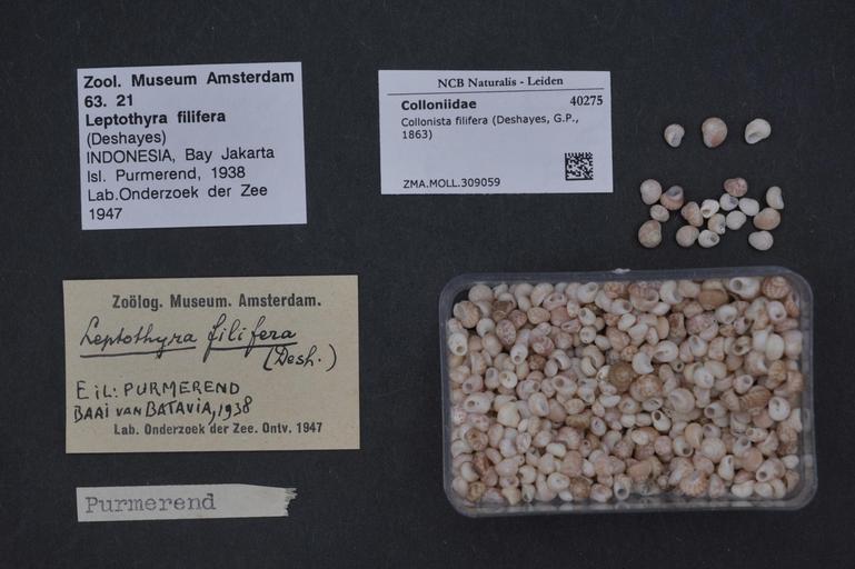 Keywords: Naturalis Biodiversity Center - ZMA.MOLL.309059 - Collonista filifera (Deshayes, G.P., 1863) - Colloniidae - Mollusc shell.jpeg artwork Dimensions artwork Document type Colloniidae Collonista Individual count Infraspecific epithet Infraspecific rank Institution Naturalis Kind of unit artwork Kind of unit specimen shell Life stage Medium artwork Nomenclatural code Source institute Zoölogisch Museum Amsterdam Scale the width of the text on the species/QR-code label is 38 mm Occurrence ID page Other fields Other versions artwork Permission license Naturalis donation CC-0 Mollusca Publication location Scientific name Collonista filifera Deshayes G P 1863 Scientific name authorship Deshayes 1863 Source url http //bioportal naturalis nl Specific epithet filifera State or province Subject keywords artwork Subject keywords publication Title artwork Title publication Type status Uploaded with GWToolset Naturalis_Biodiversity_Center_-_ZMA MOLL 309059_-_Collonista_filifera_ Deshayes _G P _1863 _-_Colloniidae_-_Mollusc_shell http //medialib naturalis nl/file/id/ZMA MOLL 309059/format/large Media donated by Naturalis Biodiversity Center Molluscs at Naturalis from the Zoölogisch Museum Amsterdam Collonista filifera Collonista |