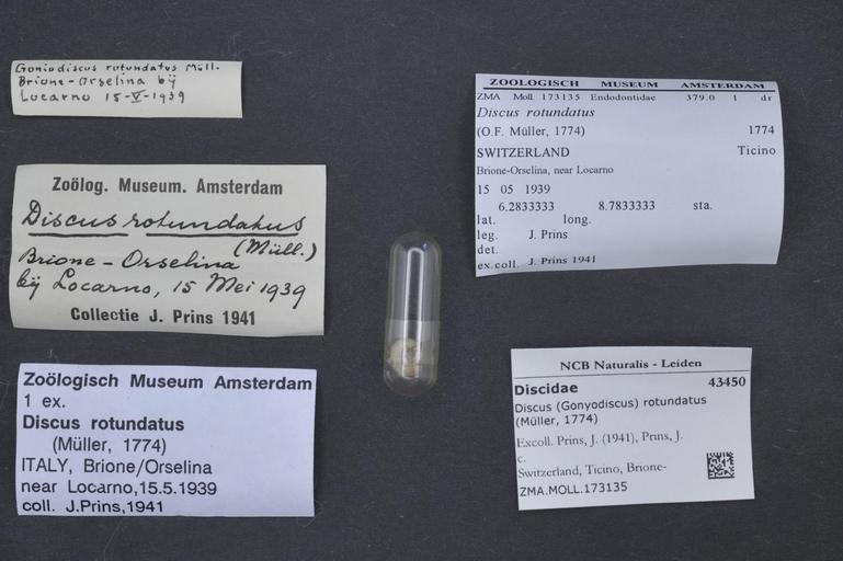 Keywords: Naturalis Biodiversity Center - ZMA.MOLL.173135 - Discus (Gonyodiscus) rotundatus (Müller, 1774) - Discidae - Mollusc shell.jpeg artwork Dimensions artwork Document type Discidae Discus Individual count Infraspecific epithet Infraspecific rank Institution Naturalis Kind of unit artwork Kind of unit specimen shell Life stage Switzerland Ticino Brione-Orselina near Locarno; lat 46 2833333 lon 8 7833333; 15-v-1939 Medium artwork Nomenclatural code Collection remarks Moll Scale the width of the text on the species/QR-code label is 38 mm Occurrence ID page Other fields Other versions artwork Permission license Naturalis donation CC-0 Mollusca Publication location Scientific name Discus Gonyodiscus rotundatus Müller 1774 Scientific name authorship Müller 1774 Source url http //bioportal naturalis nl Specific epithet rotundatus State or province Ticino Subject keywords artwork Subject keywords publication Title artwork Title publication Type status Uploaded with GWToolset Naturalis_Biodiversity_Center_-_ZMA MOLL 173135_-_Discus_ Gonyodiscus _rotundatus_ Müller _1774 _-_Discidae_-_Mollusc_shell http //medialib naturalis nl/file/id/ZMA MOLL 173135/format/large Media donated by Naturalis Biodiversity Center Molluscs at Naturalis from the Zoölogisch Museum Amsterdam Discus rotundatus Discus |
