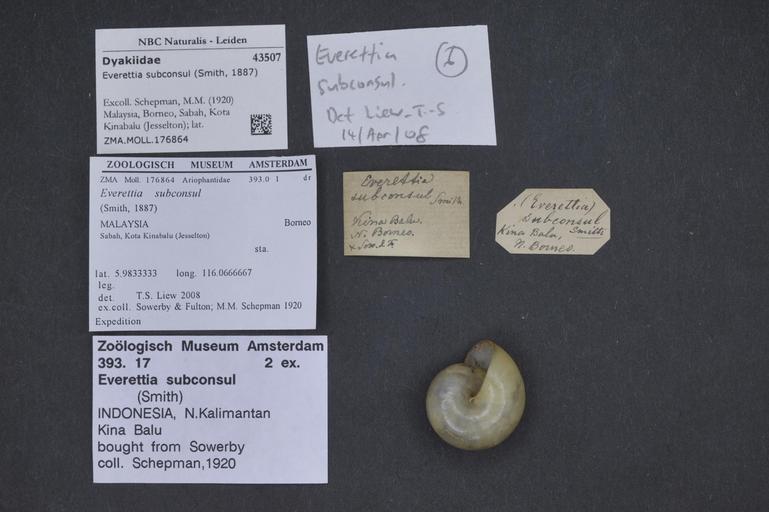 | Keywords: Naturalis Biodiversity Center - ZMA.MOLL.176864 - Everettia subconsul (Smith, 1887) - Dyakiidae - Mollusc shell.jpeg artwork Dimensions artwork Document type Dyakiidae Everettia T S Liew Individual count Infraspecific epithet Infraspecific rank Institution Naturalis Kind of unit artwork Kind of unit specimen shell Life stage Malaysia Borneo Sabah Kota Kinabalu Jesselton ; lat 5 9833333 lon 116 0666667 Medium artwork Nomenclatural code Moll Scale the width of the text on the species/QR-code label is 38 mm Occurrence ID page Other fields Other versions artwork Permission license Naturalis donation CC-0 Mollusca Publication location Scientific name Everettia subconsul Smith 1887 Scientific name authorship Smith 1887 Source url http //bioportal naturalis nl Specific epithet subconsul State or province Borneo Subject keywords artwork Subject keywords publication Title artwork Title publication Type status Uploaded with GWToolset Naturalis_Biodiversity_Center_-_ZMA MOLL 176864_-_Everettia_subconsul_ Smith _1887 _-_Dyakiidae_-_Mollusc_shell http //medialib naturalis nl/file/id/ZMA MOLL 176864/format/large Media donated by Naturalis Biodiversity Center Molluscs at Naturalis from the Zoölogisch Museum Amsterdam Everettia subconsul Everettia |