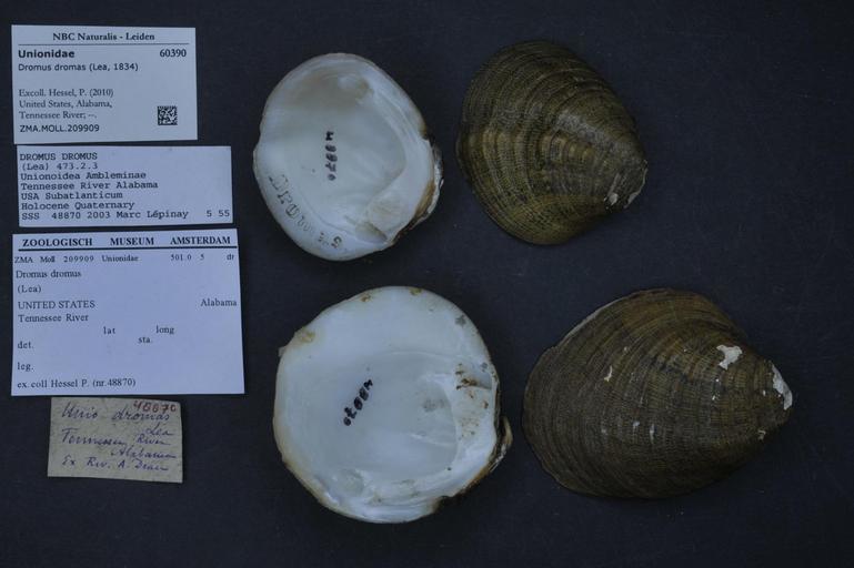 Keywords: Naturalis Biodiversity Center - ZMA.MOLL.209909 - Dromus dromas (Lea, 1834) - Unionidae - Mollusc shell.jpeg artwork Dimensions artwork Document type Unionidae subfamily Ambleminae Dromus Individual count Infraspecific epithet Infraspecific rank Institution Naturalis Kind of unit artwork Kind of unit specimen shell Life stage United States Alabama Tennessee River Medium artwork Nomenclatural code Scale the width of the text on the species/QR-code label is 38 mm Occurrence ID page Other fields Other versions artwork Permission license Naturalis donation CC-0 Mollusca Publication location Scientific name Dromus dromas Lea 1834 Scientific name authorship Lea 1834 Source url http //bioportal naturalis nl Specific epithet dromas State or province Alabama Subject keywords artwork Subject keywords publication Title artwork Title publication Type status Uploaded with GWToolset Naturalis_Biodiversity_Center_-_ZMA MOLL 209909_-_Dromus_dromas_ Lea _1834 _-_Unionidae_-_Mollusc_shell http //medialib naturalis nl/file/id/ZMA MOLL 209909/format/large Media donated by Naturalis Biodiversity Center Molluscs at Naturalis from the Zoölogisch Museum Amsterdam Dromus dromas Dromus |
