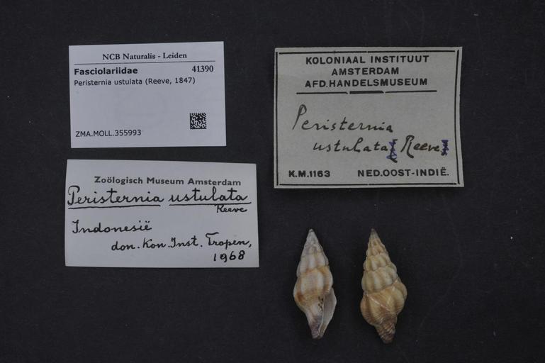 | Keywords: Naturalis Biodiversity Center - ZMA.MOLL.355993 - Peristernia ustulata (Reeve, 1847) - Fasciolariidae - Mollusc shell.jpeg artwork Dimensions artwork Document type Fasciolariidae subfamily Peristerniinae Peristernia Individual count Infraspecific epithet Infraspecific rank Institution Naturalis Kind of unit artwork Kind of unit specimen shell Life stage Medium artwork Nomenclatural code Source institute Zoölogisch Museum Amsterdam Scale the width of the text on the species/QR-code label is 38 mm Occurrence ID page Other fields Other versions artwork Permission license Naturalis donation CC-0 Mollusca Publication location Scientific name Peristernia ustulata Reeve 1847 Scientific name authorship Reeve 1847 Source url http //bioportal naturalis nl Specific epithet ustulata State or province Subject keywords artwork Subject keywords publication Title artwork Title publication Type status Uploaded with GWToolset Naturalis_Biodiversity_Center_-_ZMA MOLL 355993_-_Peristernia_ustulata_ Reeve _1847 _-_Fasciolariidae_-_Mollusc_shell http //medialib naturalis nl/file/id/ZMA MOLL 355993/format/large Media donated by Naturalis Biodiversity Center Molluscs at Naturalis from the Zoölogisch Museum Amsterdam Peristernia ustulata Peristernia |