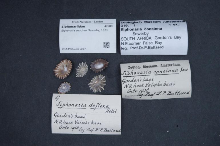 | Keywords: Naturalis Biodiversity Center - ZMA.MOLL.371027 - Siphonaria concinna Sowerby, 1823 - Siphonariidae - Mollusc shell.jpeg artwork Dimensions artwork Document type Siphonariidae Siphonaria Individual count Infraspecific epithet Infraspecific rank Institution Naturalis Kind of unit artwork Kind of unit specimen shell Life stage Medium artwork Nomenclatural code Source institute Zoölogisch Museum Amsterdam Scale the width of the text on the species/QR-code label is 38 mm Occurrence ID page Other fields Other versions artwork Permission license Naturalis donation CC-0 Mollusca Publication location Scientific name Siphonaria concinna Sowerby 1823 Scientific name authorship Sowerby 1823 Source url http //bioportal naturalis nl Specific epithet concinna State or province Subject keywords artwork Subject keywords publication Title artwork Title publication Type status Uploaded with GWToolset Naturalis_Biodiversity_Center_-_ZMA MOLL 371027_-_Siphonaria_concinna_Sowerby _1823_-_Siphonariidae_-_Mollusc_shell http //medialib naturalis nl/file/id/ZMA MOLL 371027/format/large Media donated by Naturalis Biodiversity Center Molluscs at Naturalis from the Zoölogisch Museum Amsterdam Siphonaria concinna Siphonaria |