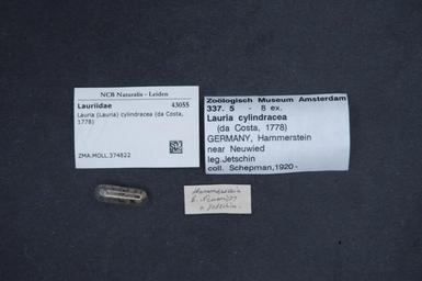 | Keywords: Naturalis Biodiversity Center - ZMA.MOLL.374822 - Lauria (Lauria) cylindracea (Da Costa, 1778) - Lauriidae - Mollusc shell.jpeg artwork Dimensions artwork Document type Lauriidae Lauria Individual count Infraspecific epithet Infraspecific rank Institution Naturalis Kind of unit artwork Kind of unit specimen shell Life stage Medium artwork Nomenclatural code Source institute Rijksmuseum van Natuurlijke Historie Leiden Scale the width of the text on the species/QR-code label is 38 mm Occurrence ID page Other fields Other versions artwork Permission license Naturalis donation CC-0 Mollusca Publication location Scientific name Lauria Lauria cylindracea Da Costa 1778 Scientific name authorship Da Costa 1778 Source url http //bioportal naturalis nl Specific epithet cylindracea State or province Subject keywords artwork Subject keywords publication Title artwork Title publication Type status Uploaded with GWToolset Naturalis_Biodiversity_Center_-_ZMA MOLL 374822_-_Lauria_ Lauria _cylindracea_ Da_Costa _1778 _-_Lauriidae_-_Mollusc_shell http //medialib naturalis nl/file/id/ZMA MOLL 374822/format/large Molluscs at Naturalis from the Zoölogisch Museum Amsterdam Media donated by Naturalis Biodiversity Center Lauria cylindracea Lauria |