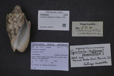 Keywords: Naturalis Biodiversity Center - ZMA.MOLL.226374 - Cymbiola vespertilio Linnaeus, 1758 - Volutidae - Mollusc shell.jpeg artwork Dimensions artwork Document type Volutidae Cymbiola Individual count Infraspecific epithet Infraspecific rank Institution Naturalis Kind of unit artwork Kind of unit specimen shell Life stage Medium artwork Nomenclatural code Scale the width of the text on the species/QR-code label is 38 mm Occurrence ID page Neogastropoda Other fields Other versions artwork Permission license Naturalis donation CC-0 Mollusca Publication location Scientific name Cymbiola vespertilio Linnaeus 1758 Scientific name authorship Linnaeus 1758 Source url http //bioportal naturalis nl Specific epithet vespertilio State or province Subject keywords artwork Subject keywords publication Title artwork Title publication Type status Uploaded with GWToolset Naturalis_Biodiversity_Center_-_ZMA MOLL 226374_-_Cymbiola_vespertilio_Linnaeus _1758_-_Volutidae_-_Mollusc_shell http //medialib naturalis nl/file/id/ZMA MOLL 226374/format/large Media donated by Naturalis Biodiversity Center Molluscs at Naturalis from the Zoölogisch Museum Amsterdam Cymbiola vespertilio Cymbiola |