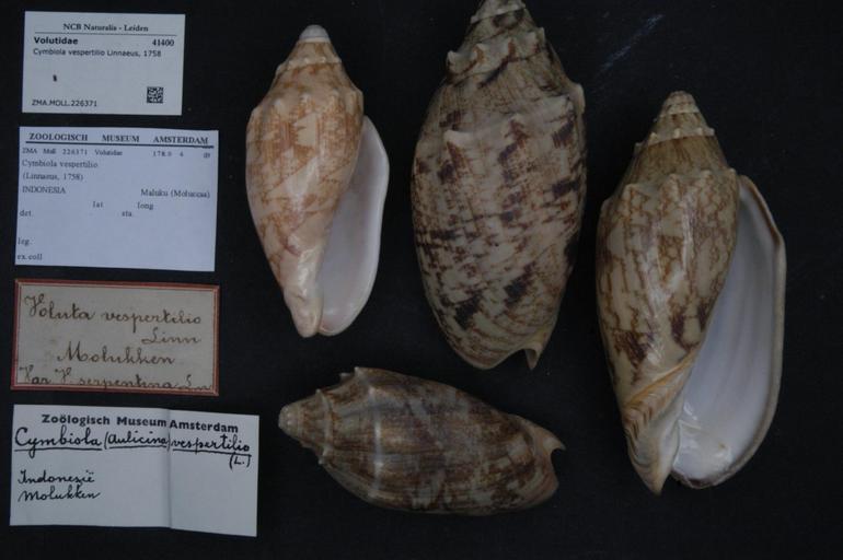 Keywords: Naturalis Biodiversity Center - ZMA.MOLL.226371 - Cymbiola vespertilio Linnaeus, 1758 - Volutidae - Mollusc shell.jpeg artwork Dimensions artwork Document type Volutidae Cymbiola Individual count Infraspecific epithet Infraspecific rank Institution Naturalis Kind of unit artwork Kind of unit specimen shell Life stage Medium artwork Nomenclatural code Scale the width of the text on the species/QR-code label is 38 mm Occurrence ID page Neogastropoda Other fields Other versions artwork Permission license Naturalis donation CC-0 Mollusca Publication location Scientific name Cymbiola vespertilio Linnaeus 1758 Scientific name authorship Linnaeus 1758 Source url http //bioportal naturalis nl Specific epithet vespertilio State or province Subject keywords artwork Subject keywords publication Title artwork Title publication Type status Uploaded with GWToolset Naturalis_Biodiversity_Center_-_ZMA MOLL 226371_-_Cymbiola_vespertilio_Linnaeus _1758_-_Volutidae_-_Mollusc_shell http //medialib naturalis nl/file/id/ZMA MOLL 226371/format/large Media donated by Naturalis Biodiversity Center Molluscs at Naturalis from the Zoölogisch Museum Amsterdam Cymbiola vespertilio Cymbiola |