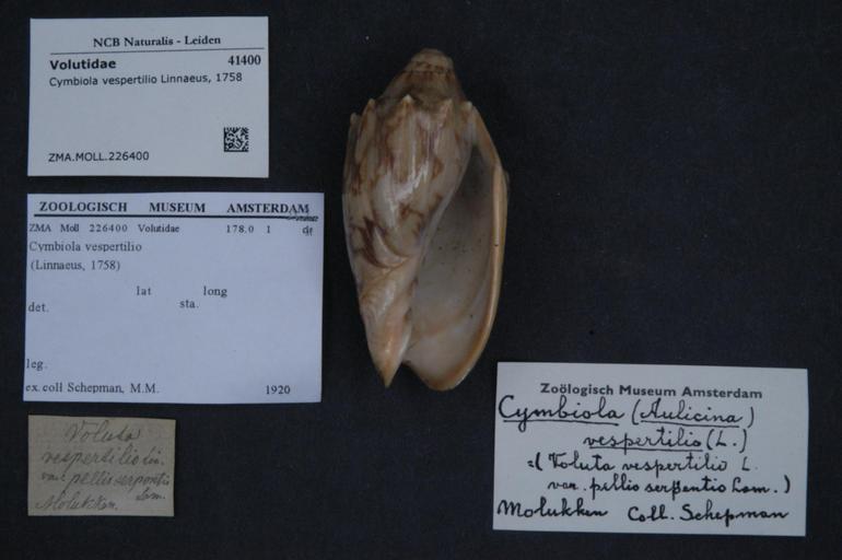 Keywords: Naturalis Biodiversity Center - ZMA.MOLL.226400 - Cymbiola vespertilio Linnaeus, 1758 - Volutidae - Mollusc shell.jpeg artwork Dimensions artwork Document type Volutidae Cymbiola Individual count Infraspecific epithet Infraspecific rank Institution Naturalis Kind of unit artwork Kind of unit specimen shell Life stage Medium artwork Nomenclatural code Scale the width of the text on the species/QR-code label is 38 mm Occurrence ID page Neogastropoda Other fields Other versions artwork Permission license Naturalis donation CC-0 Mollusca Publication location Scientific name Cymbiola vespertilio Linnaeus 1758 Scientific name authorship Linnaeus 1758 Source url http //bioportal naturalis nl Specific epithet vespertilio State or province Subject keywords artwork Subject keywords publication Title artwork Title publication Type status Uploaded with GWToolset Naturalis_Biodiversity_Center_-_ZMA MOLL 226400_-_Cymbiola_vespertilio_Linnaeus _1758_-_Volutidae_-_Mollusc_shell http //medialib naturalis nl/file/id/ZMA MOLL 226400/format/large Media donated by Naturalis Biodiversity Center Molluscs at Naturalis from the Zoölogisch Museum Amsterdam Cymbiola vespertilio Cymbiola |