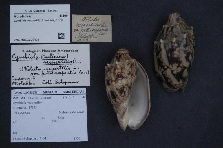 Keywords: Naturalis Biodiversity Center - ZMA.MOLL.226405 - Cymbiola vespertilio Linnaeus, 1758 - Volutidae - Mollusc shell.jpeg artwork Dimensions artwork Document type Volutidae Cymbiola Individual count Infraspecific epithet Infraspecific rank Institution Naturalis Kind of unit artwork Kind of unit specimen shell Life stage Medium artwork Nomenclatural code Scale the width of the text on the species/QR-code label is 38 mm Occurrence ID page Neogastropoda Other fields Other versions artwork Permission license Naturalis donation CC-0 Mollusca Publication location Scientific name Cymbiola vespertilio Linnaeus 1758 Scientific name authorship Linnaeus 1758 Source url http //bioportal naturalis nl Specific epithet vespertilio State or province Subject keywords artwork Subject keywords publication Title artwork Title publication Type status Uploaded with GWToolset Naturalis_Biodiversity_Center_-_ZMA MOLL 226405_-_Cymbiola_vespertilio_Linnaeus _1758_-_Volutidae_-_Mollusc_shell http //medialib naturalis nl/file/id/ZMA MOLL 226405/format/large Media donated by Naturalis Biodiversity Center Molluscs at Naturalis from the Zoölogisch Museum Amsterdam Cymbiola vespertilio Cymbiola |