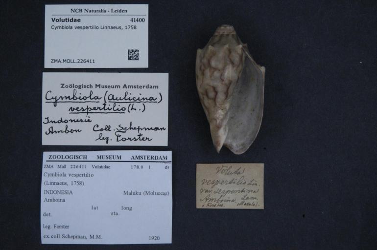 Keywords: Naturalis Biodiversity Center - ZMA.MOLL.226411 - Cymbiola vespertilio Linnaeus, 1758 - Volutidae - Mollusc shell.jpeg artwork Dimensions artwork Document type Volutidae Cymbiola Individual count Infraspecific epithet Infraspecific rank Institution Naturalis Kind of unit artwork Kind of unit specimen shell Life stage Medium artwork Nomenclatural code Scale the width of the text on the species/QR-code label is 38 mm Occurrence ID page Neogastropoda Other fields Other versions artwork Permission license Naturalis donation CC-0 Mollusca Publication location Scientific name Cymbiola vespertilio Linnaeus 1758 Scientific name authorship Linnaeus 1758 Source url http //bioportal naturalis nl Specific epithet vespertilio State or province Subject keywords artwork Subject keywords publication Title artwork Title publication Type status Uploaded with GWToolset Naturalis_Biodiversity_Center_-_ZMA MOLL 226411_-_Cymbiola_vespertilio_Linnaeus _1758_-_Volutidae_-_Mollusc_shell http //medialib naturalis nl/file/id/ZMA MOLL 226411/format/large Media donated by Naturalis Biodiversity Center Molluscs at Naturalis from the Zoölogisch Museum Amsterdam Cymbiola vespertilio Cymbiola |