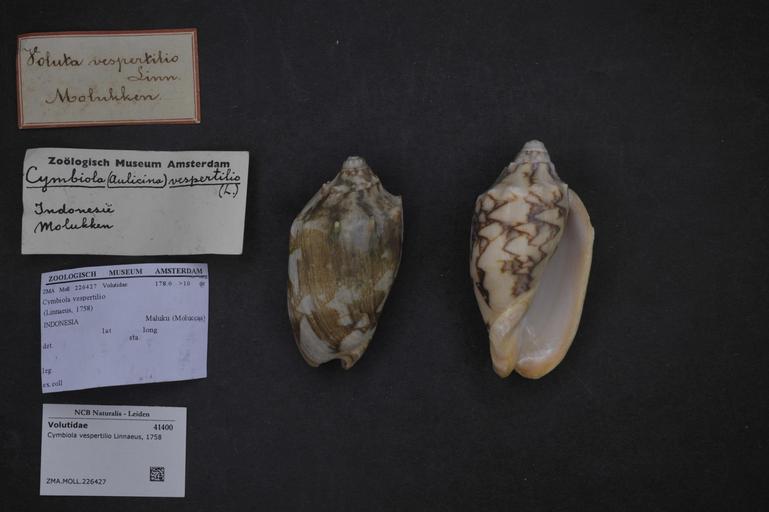 Keywords: Naturalis Biodiversity Center - ZMA.MOLL.226427 - Cymbiola vespertilio Linnaeus, 1758 - Volutidae - Mollusc shell.jpeg artwork Dimensions artwork Document type Volutidae Cymbiola Individual count Infraspecific epithet Infraspecific rank Institution Naturalis Kind of unit artwork Kind of unit specimen shell Life stage Medium artwork Nomenclatural code Scale the width of the text on the species/QR-code label is 38 mm Occurrence ID page Neogastropoda Other fields Other versions artwork Permission license Naturalis donation CC-0 Mollusca Publication location Scientific name Cymbiola vespertilio Linnaeus 1758 Scientific name authorship Linnaeus 1758 Source url http //bioportal naturalis nl Specific epithet vespertilio State or province Subject keywords artwork Subject keywords publication Title artwork Title publication Type status Uploaded with GWToolset Naturalis_Biodiversity_Center_-_ZMA MOLL 226427_-_Cymbiola_vespertilio_Linnaeus _1758_-_Volutidae_-_Mollusc_shell http //medialib naturalis nl/file/id/ZMA MOLL 226427/format/large Media donated by Naturalis Biodiversity Center Molluscs at Naturalis from the Zoölogisch Museum Amsterdam Cymbiola vespertilio Cymbiola |