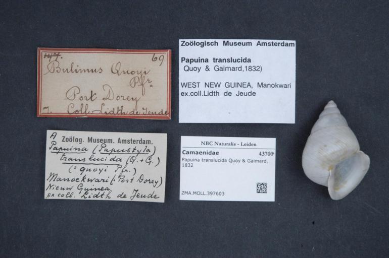 Keywords: Naturalis Biodiversity Center - ZMA.MOLL.397603 - Papuina translucida Quoy & Gaimard, 1832 - Camaenidae - Mollusc shell.jpeg artwork Dimensions artwork Document type Camaenidae subfamily Papuininae Papuina Individual count Infraspecific epithet Infraspecific rank Institution Naturalis Kind of unit artwork Kind of unit specimen shell Life stage Medium artwork Nomenclatural code Source institute Rijksmuseum van Natuurlijke Historie Leiden Scale the width of the text on the species/QR-code label is 38 mm Occurrence ID page Other fields Other versions artwork Permission license Naturalis donation CC-0 Mollusca Publication location Scientific name Papuina translucida Quoy Gaimard 1832 Scientific name authorship Quoy Gaimard 1832 Source url http //bioportal naturalis nl Specific epithet translucida State or province Subject keywords artwork Subject keywords publication Title artwork Title publication Type status Uploaded with GWToolset Naturalis_Biodiversity_Center_-_ZMA MOLL 397603_-_Papuina_translucida_Quoy_ _Gaimard _1832_-_Camaenidae_-_Mollusc_shell http //medialib naturalis nl/file/id/ZMA MOLL 397603/format/large Molluscs at Naturalis from the Zoölogisch Museum Amsterdam Media donated by Naturalis Biodiversity Center Papuina translucida Papuina |