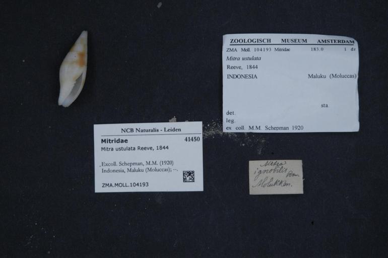 | Keywords: Naturalis Biodiversity Center - ZMA.MOLL.104193 - Mitra ustulata Reeve, 1844 - Mitridae - Mollusc shell.jpeg artwork Dimensions artwork Document type Mitridae subfamily Mitrinae Mitra Individual count Infraspecific epithet Infraspecific rank Institution Naturalis Kind of unit artwork Kind of unit specimen shell Life stage Indonesia Maluku Moluccas Medium artwork Nomenclatural code Collection remarks Moll Scale the width of the text on the species/QR-code label is 38 mm Occurrence ID page Neogastropoda Other fields Other versions artwork Permission license Naturalis donation CC-0 Mollusca Publication location Scientific name Mitra ustulata Reeve 1844 Scientific name authorship Reeve 1844 Source url http //bioportal naturalis nl Specific epithet ustulata State or province Maluku Moluccas Subject keywords artwork Subject keywords publication Title artwork Title publication Type status Uploaded with GWToolset Naturalis_Biodiversity_Center_-_ZMA MOLL 104193_-_Mitra_ustulata_Reeve _1844_-_Mitridae_-_Mollusc_shell http //medialib naturalis nl/file/id/ZMA MOLL 104193/format/large Media donated by Naturalis Biodiversity Center Molluscs at Naturalis from the Zoölogisch Museum Amsterdam Mitra ustulata |