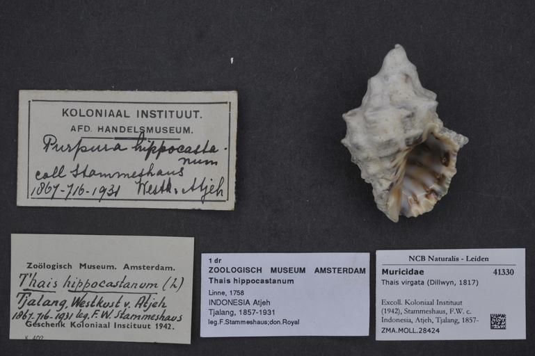 | Keywords: Naturalis Biodiversity Center - ZMA.MOLL.28424 - Thais virgata (Dillwyn, 1817) - Muricidae - Mollusc shell.jpeg artwork Dimensions artwork Document type Muricidae subfamily Rapaninae Thais Individual count Infraspecific epithet Infraspecific rank Institution Naturalis Kind of unit artwork Kind of unit specimen shell Life stage Indonesia Atjeh Tjalang 1857-1931 Medium artwork Nomenclatural code Scale the width of the text on the species/QR-code label is 38 mm Occurrence ID page Neogastropoda Other fields Other versions artwork Permission license Naturalis donation CC-0 Mollusca Publication location Scientific name Thais virgata Dillwyn 1817 Scientific name authorship Dillwyn 1817 Source url http //bioportal naturalis nl Specific epithet virgata State or province Atjeh Subject keywords artwork Subject keywords publication Title artwork Title publication Type status Uploaded with GWToolset Naturalis_Biodiversity_Center_-_ZMA MOLL 28424_-_Thais_virgata_ Dillwyn _1817 _-_Muricidae_-_Mollusc_shell http //medialib naturalis nl/file/id/ZMA MOLL 28424/format/large Media donated by Naturalis Biodiversity Center Molluscs at Naturalis from the Zoölogisch Museum Amsterdam Thais virgata |