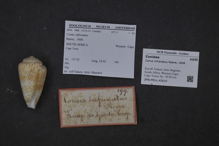 | Keywords: Naturalis Biodiversity Center - ZMA.MOLL.42610 - Conus infrenatus Reeve, 1848 - Conidae - Mollusc shell.jpeg artwork Dimensions artwork Document type Conidae Conus Individual count Infraspecific epithet Infraspecific rank Institution Naturalis Kind of unit artwork Kind of unit specimen shell Life stage South Africa Western Cape Cape Town; lat -33 92 lon 18 42 Medium artwork Nomenclatural code Source institute Zoölogisch Museum Amsterdam Scale the width of the text on the species/QR-code label is 38 mm Occurrence ID page Other fields Other versions artwork Permission license Naturalis donation CC-0 Mollusca Publication location Scientific name Conus infrenatus Reeve 1848 Scientific name authorship Reeve 1848 Source url http //bioportal naturalis nl Specific epithet infrenatus State or province Western Cape Subject keywords artwork Subject keywords publication Title artwork Title publication Type status Uploaded with GWToolset Naturalis_Biodiversity_Center_-_ZMA MOLL 42610_-_Conus_infrenatus_Reeve _1848_-_Conidae_-_Mollusc_shell http //medialib naturalis nl/file/id/ZMA MOLL 42610/format/large Molluscs at Naturalis from the Zoölogisch Museum Amsterdam Media donated by Naturalis Biodiversity Center Conus infrenatus Conus |