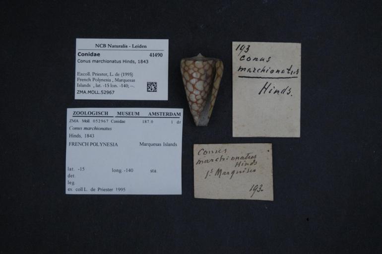 Keywords: Naturalis Biodiversity Center - ZMA.MOLL.52967 - Conus marchionatus Hinds, 1843 - Conidae - Mollusc shell.jpeg artwork Dimensions artwork Document type Conidae Conus Individual count Infraspecific epithet Infraspecific rank Institution Naturalis Kind of unit artwork Kind of unit specimen shell Life stage French Polynesia Marquesas Islands lat -15 lon -140 Medium artwork Nomenclatural code Source institute Zoölogisch Museum Amsterdam Scale the width of the text on the species/QR-code label is 38 mm Occurrence ID page Other fields Other versions artwork Permission license Naturalis donation CC-0 Mollusca Publication location Scientific name Conus marchionatus Hinds 1843 Scientific name authorship Hinds 1843 Source url http //bioportal naturalis nl Specific epithet marchionatus State or province Marquesas Islands Subject keywords artwork Subject keywords publication Title artwork Title publication Type status Uploaded with GWToolset Naturalis_Biodiversity_Center_-_ZMA MOLL 52967_-_Conus_marchionatus_Hinds _1843_-_Conidae_-_Mollusc_shell http //medialib naturalis nl/file/id/ZMA MOLL 52967/format/large Molluscs at Naturalis from the Zoölogisch Museum Amsterdam Media donated by Naturalis Biodiversity Center Conus marchionatus Conus |