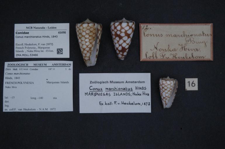Keywords: Naturalis Biodiversity Center - ZMA.MOLL.53466 - Conus marchionatus Hinds, 1843 - Conidae - Mollusc shell.jpeg artwork Dimensions artwork Document type Conidae Conus Individual count Infraspecific epithet Infraspecific rank Institution Naturalis Kind of unit artwork Kind of unit specimen shell Life stage French Polynesia Marquesas Islands Nuka Hiva; lat -15 lon -140 Medium artwork Nomenclatural code Source institute Zoölogisch Museum Amsterdam Scale the width of the text on the species/QR-code label is 38 mm Occurrence ID page Other fields Other versions artwork Permission license Naturalis donation CC-0 Mollusca Publication location Scientific name Conus marchionatus Hinds 1843 Scientific name authorship Hinds 1843 Source url http //bioportal naturalis nl Specific epithet marchionatus State or province Marquesas Islands Subject keywords artwork Subject keywords publication Title artwork Title publication Type status Uploaded with GWToolset Naturalis_Biodiversity_Center_-_ZMA MOLL 53466_-_Conus_marchionatus_Hinds _1843_-_Conidae_-_Mollusc_shell http //medialib naturalis nl/file/id/ZMA MOLL 53466/format/large Molluscs at Naturalis from the Zoölogisch Museum Amsterdam Media donated by Naturalis Biodiversity Center Conus marchionatus Conus |