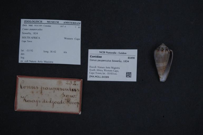 | Keywords: Naturalis Biodiversity Center - ZMA.MOLL.64389 - Conus pauperculus Sowerby, 1834 - Conidae - Mollusc shell.jpeg artwork Dimensions artwork Document type Conidae Conus Individual count Infraspecific epithet Infraspecific rank Institution Naturalis Kind of unit artwork Kind of unit specimen shell Life stage South Africa Western Cape Cape Town; lat -33 92 lon 18 42 Medium artwork Nomenclatural code Source institute Zoölogisch Museum Amsterdam Scale the width of the text on the species/QR-code label is 38 mm Occurrence ID page Other fields Other versions artwork Permission license Naturalis donation CC-0 Mollusca Publication location Scientific name Conus pauperculus Sowerby 1834 Scientific name authorship Sowerby 1834 Source url http //bioportal naturalis nl Specific epithet pauperculus State or province Western Cape Subject keywords artwork Subject keywords publication Title artwork Title publication Type status Uploaded with GWToolset Naturalis_Biodiversity_Center_-_ZMA MOLL 64389_-_Conus_pauperculus_Sowerby _1834_-_Conidae_-_Mollusc_shell http //medialib naturalis nl/file/id/ZMA MOLL 64389/format/large Molluscs at Naturalis from the Zoölogisch Museum Amsterdam Media donated by Naturalis Biodiversity Center Conus pauperculus Conus |