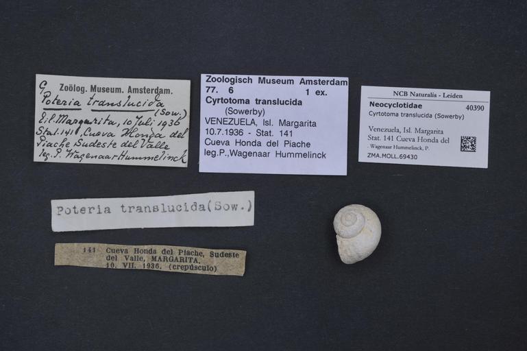 Keywords: Naturalis Biodiversity Center - ZMA.MOLL.69430 - Cyrtotoma translucida Sowerby - Neocyclotidae - Mollusc shell.jpeg artwork Dimensions artwork Document type Neocyclotidae Cyrtotoma Individual count Infraspecific epithet Infraspecific rank Institution Naturalis Kind of unit artwork Kind of unit specimen shell Life stage Venezuela Isl Margarita Stat 141 Cueva Honda del Piache; 10-vii-1936 Medium artwork Nomenclatural code Source institute Zoölogisch Museum Amsterdam Scale the width of the text on the species/QR-code label is 38 mm Occurrence ID page Other fields Other versions artwork Permission license Naturalis donation CC-0 Mollusca Publication location Scientific name Cyrtotoma translucida Sowerby Scientific name authorship Sowerby Source url http //bioportal naturalis nl Specific epithet translucida State or province Isla Margarita Subject keywords artwork Subject keywords publication Title artwork Title publication Type status Uploaded with GWToolset Naturalis_Biodiversity_Center_-_ZMA MOLL 69430_-_Cyrtotoma_translucida_Sowerby_-_Neocyclotidae_-_Mollusc_shell http //medialib naturalis nl/file/id/ZMA MOLL 69430/format/large Molluscs at Naturalis from the Zoölogisch Museum Amsterdam Media donated by Naturalis Biodiversity Center Cyrtotoma translucida Cyrtotoma |