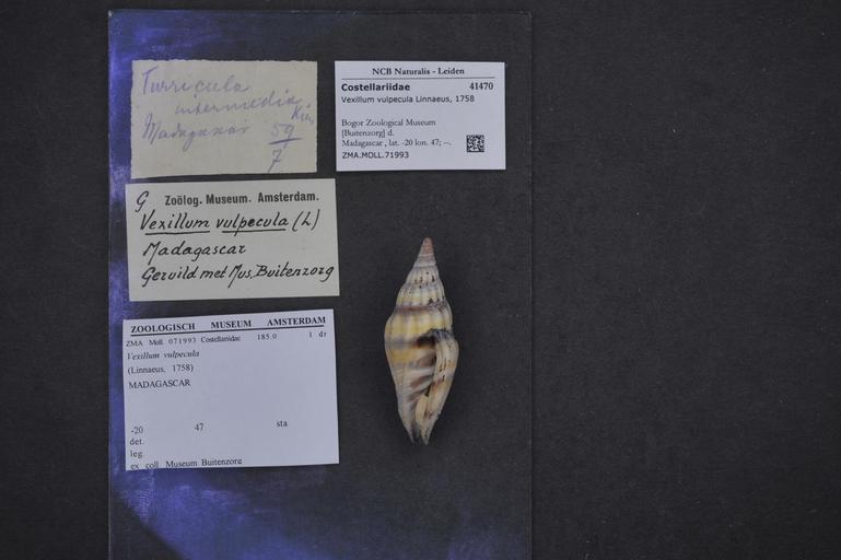 Keywords: Naturalis Biodiversity Center - ZMA.MOLL.71993 - Vexillum vulpecula (Linnaeus, 1758) - Costellariidae - Mollusc shell.jpeg artwork Dimensions artwork Document type Costellariidae Vexillum Individual count Infraspecific epithet Infraspecific rank Institution Naturalis Kind of unit artwork Kind of unit specimen shell Life stage Madagascar lat -20 lon 47 Medium artwork Nomenclatural code Collection remarks Moll Source institute Zoölogisch Museum Amsterdam Scale the width of the text on the species/QR-code label is 38 mm Occurrence ID page Neogastropoda Other fields Other versions artwork Permission license Naturalis donation CC-0 Mollusca Publication location Scientific name Vexillum vulpecula Linnaeus 1758 Scientific name authorship Linnaeus 1758 Source url http //bioportal naturalis nl Specific epithet vulpecula State or province Subject keywords artwork Subject keywords publication Title artwork Title publication Type status Uploaded with GWToolset Naturalis_Biodiversity_Center_-_ZMA MOLL 71993_-_Vexillum_vulpecula_ Linnaeus _1758 _-_Costellariidae_-_Mollusc_shell http //medialib naturalis nl/file/id/ZMA MOLL 71993/format/large Molluscs at Naturalis from the Zoölogisch Museum Amsterdam Media donated by Naturalis Biodiversity Center Vexillum vulpecula Vexillum