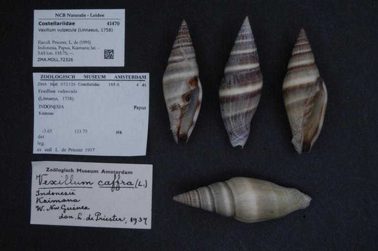 Keywords: Naturalis Biodiversity Center - ZMA.MOLL.72326 - Vexillum vulpecula (Linnaeus, 1758) - Costellariidae - Mollusc shell.jpeg artwork Dimensions artwork Document type Costellariidae Vexillum Individual count Infraspecific epithet Infraspecific rank Institution Naturalis Kind of unit artwork Kind of unit specimen shell Life stage Indonesia Papua Kaimana; lat -3 65 lon 133 75 Medium artwork Nomenclatural code Collection remarks Moll Source institute Zoölogisch Museum Amsterdam Scale the width of the text on the species/QR-code label is 38 mm Occurrence ID page Neogastropoda Other fields Other versions artwork Permission license Naturalis donation CC-0 Mollusca Publication location Scientific name Vexillum vulpecula Linnaeus 1758 Scientific name authorship Linnaeus 1758 Source url http //bioportal naturalis nl Specific epithet vulpecula State or province Papua Subject keywords artwork Subject keywords publication Title artwork Title publication Type status Uploaded with GWToolset Naturalis_Biodiversity_Center_-_ZMA MOLL 72326_-_Vexillum_vulpecula_ Linnaeus _1758 _-_Costellariidae_-_Mollusc_shell http //medialib naturalis nl/file/id/ZMA MOLL 72326/format/large Molluscs at Naturalis from the Zoölogisch Museum Amsterdam Media donated by Naturalis Biodiversity Center Vexillum vulpecula Vexillum |